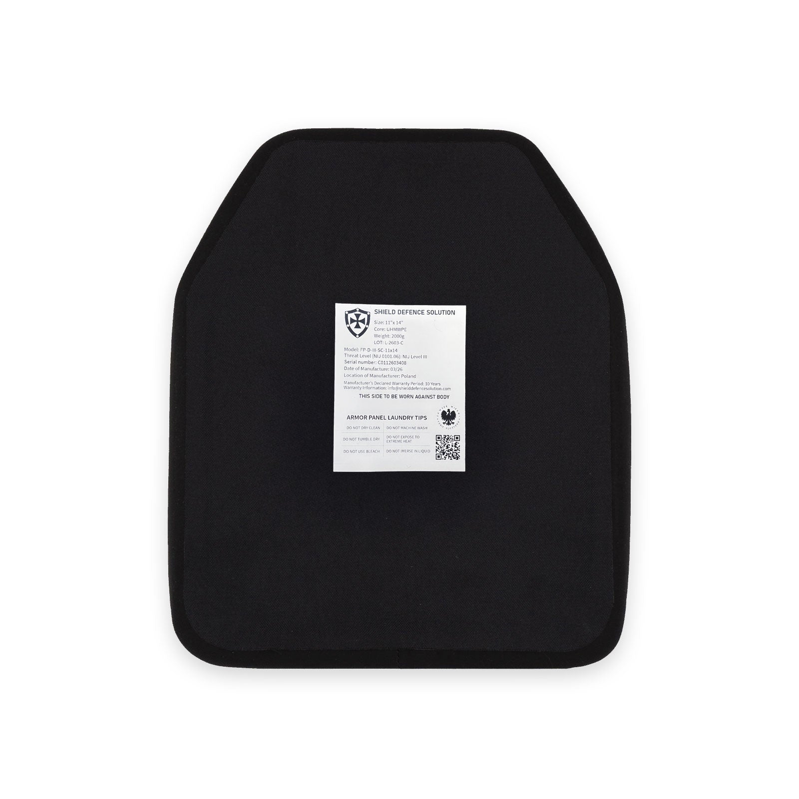 Hard ballistic plate designed for installation in a plate carrier or tactical vest. Built for standalone use, it does not require any additional soft armor backing and is engineered to withstand multiple impacts within its rated protection standard.